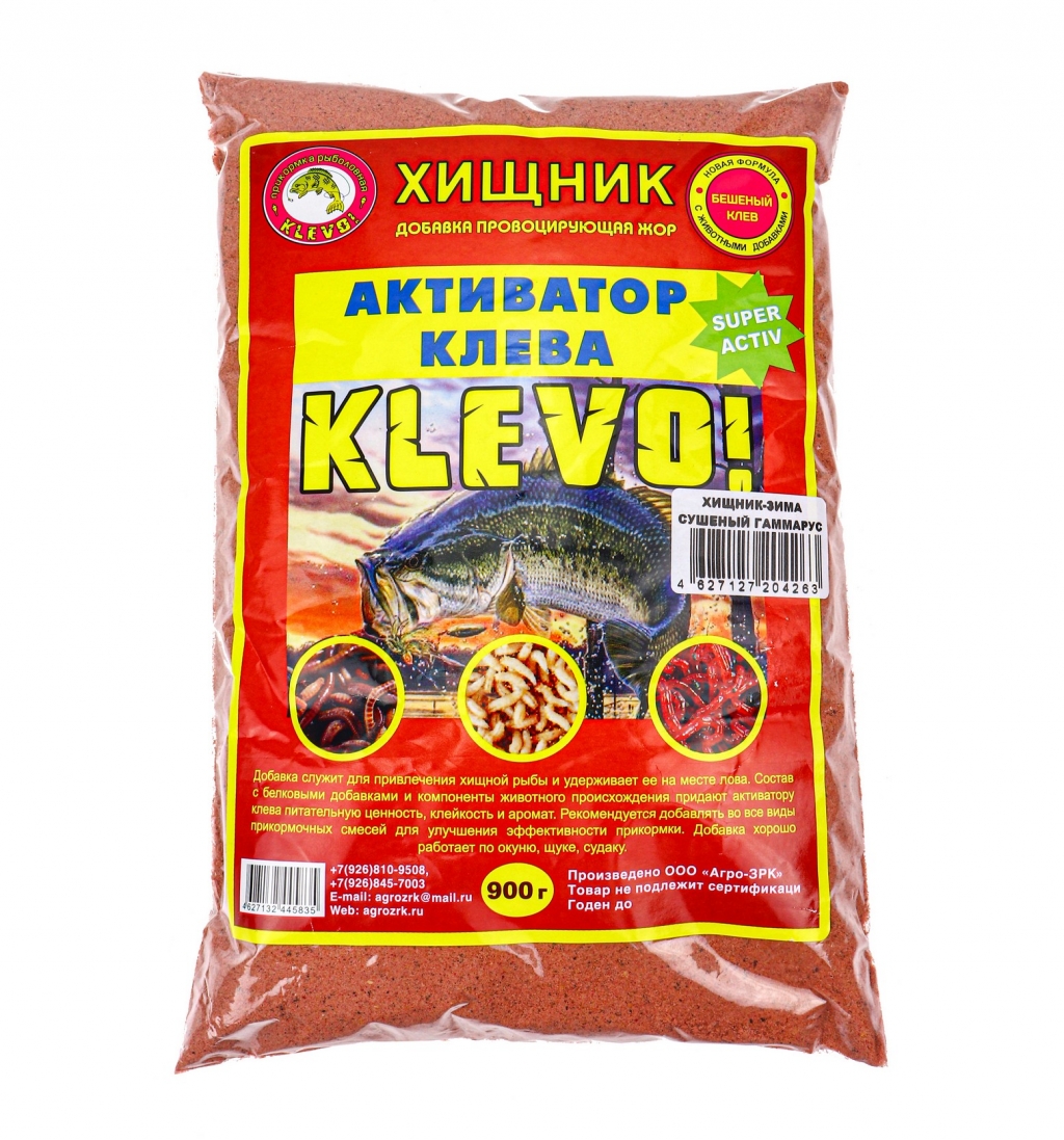 Главная > Зимняя рыбалка > Прикормка > Прикормочные компоненты > Активатор клева Klevo Хищник Гаммарус 900 гр